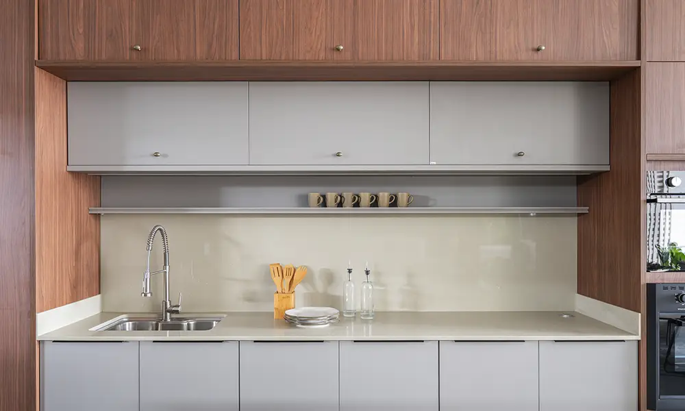 Além desses, o vidro aparece com frequência em portas de armários superiores, trazendo leveza visual e ajudando a ampliar a sensação de espaço. Já a laca, com acabamento uniforme e sofisticado, é uma escolha comum em projetos que buscam um visual mais contemporâneo, embora exija um pouco mais de cuidado no uso diário.