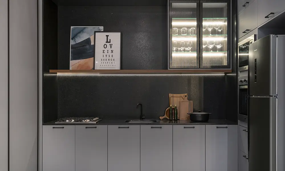 As fitas de LED embutidas nos armários são grandes aliadas: iluminam superfícies de trabalho, evitam sombras e valorizam os detalhes do projeto sem excesso de luz.